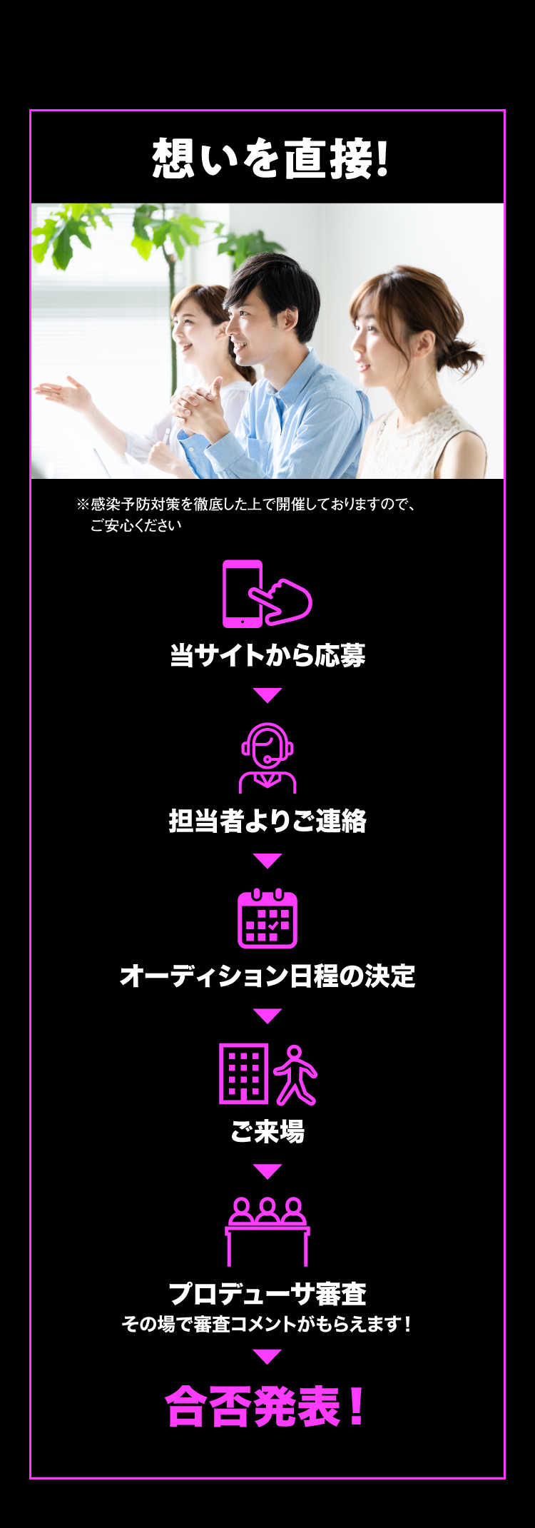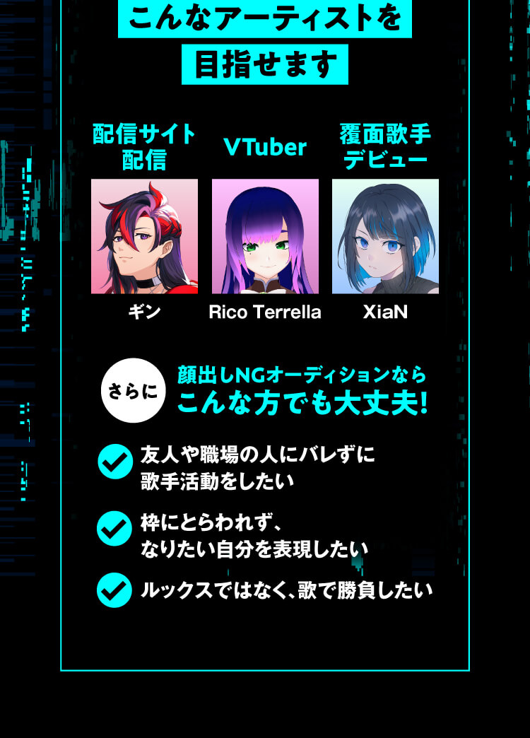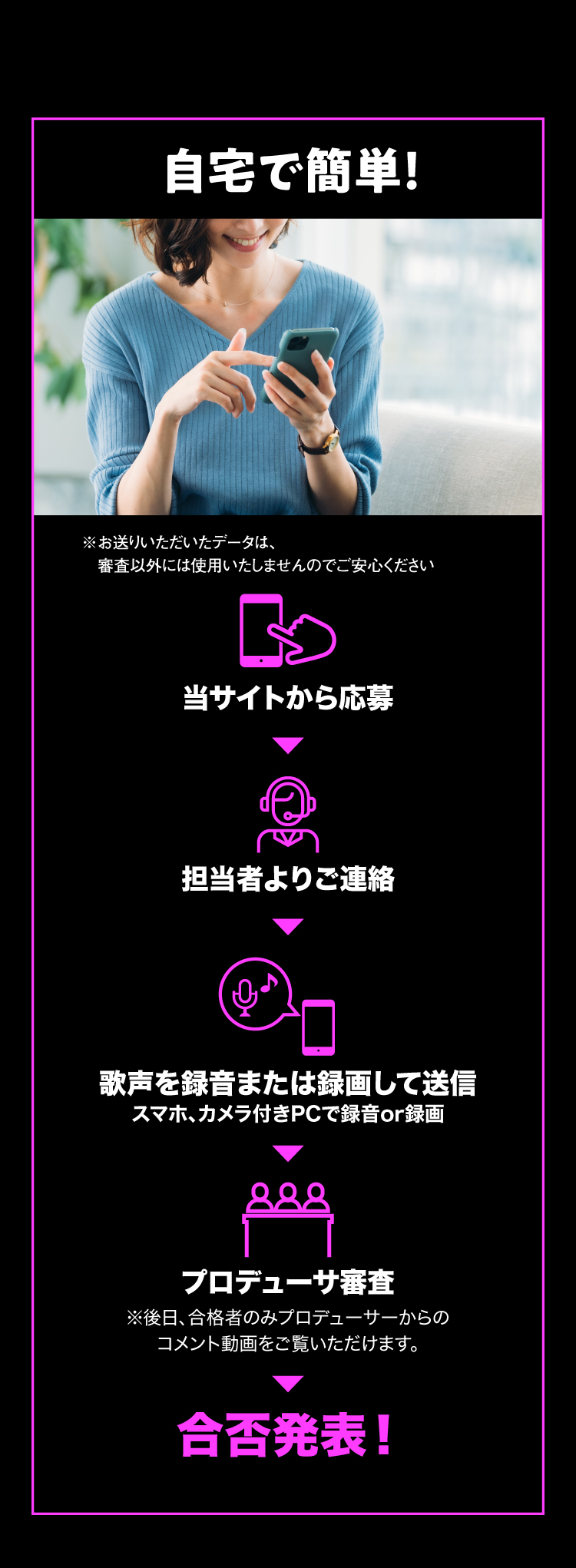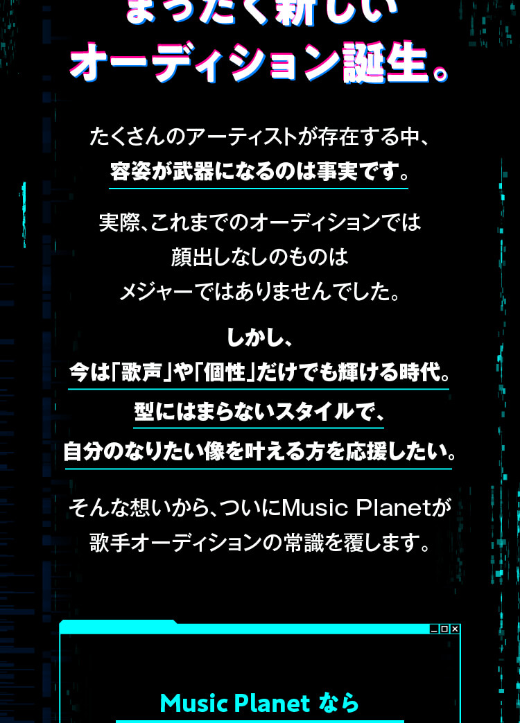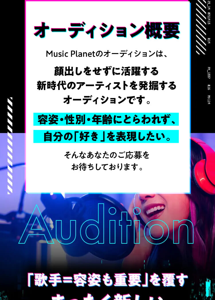 オーディションは事前の書類審査を一切行っていません。エントリーいただいた方全員の「想いと歌唱」を、音楽プロデューサーが直接審査します。