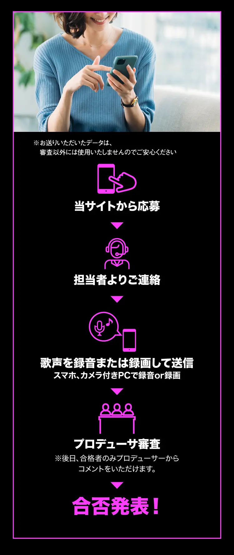 オーディションは事前の書類審査を一切行っていません。エントリーいただいた方全員の「想いと歌唱」を、音楽プロデューサーが直接審査します。