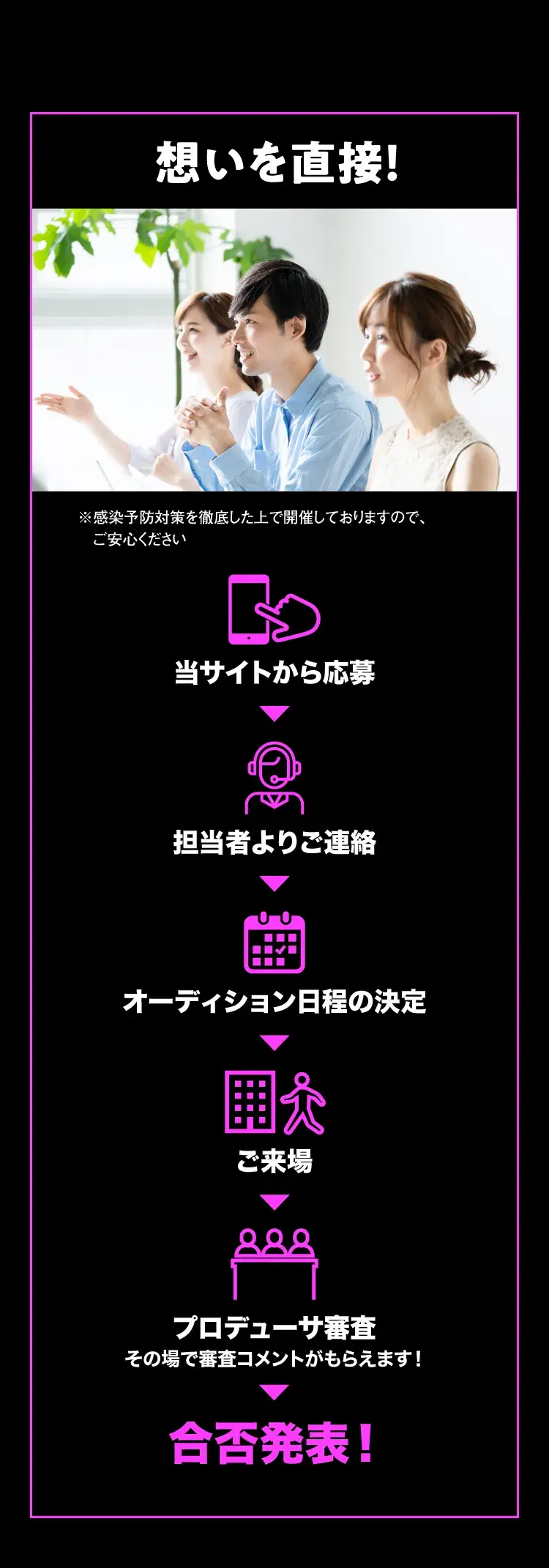オーディションは事前の書類審査を一切行っていません。エントリーいただいた方全員の「想いと歌唱」を、音楽プロデューサーが直接審査します。